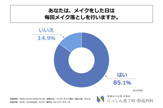 続いて、「メイクをした日は毎回メイク落としを行うか」を尋ねる設問への回答では、「はい」が85.1%、「いいえ」が14.9%という結果になりました。この結果から、20代~30代の女性の85%以上が、メイクをした日は毎回メイク落としを行っていることが判明しました。