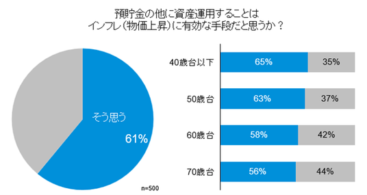 インフレ局面では、預貯金以外の資産運用を「有効」だと捉える経営者が61%となり、若い層ほど運用を前向きに評価する傾向が見られました。