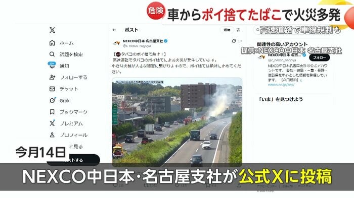 ネクスコ中日本が過去のポイ捨てによる火災映像をXで公開し注意喚起したところ、大きな反響と批判の声が上がった。