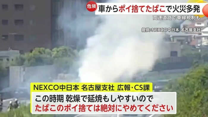 高速道路の火災動画を投稿したネクスコ中日本 名古屋支社 広報・CS課は、「この時期、乾燥で延焼もしやすいので、たばこのポイ捨ては絶対にやめてください」と注意を呼びかけている。