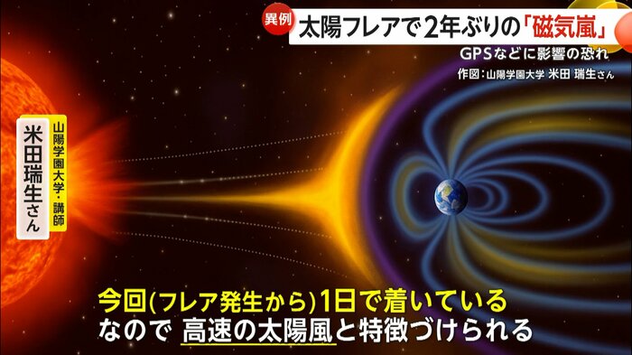 太陽風は太陽から吹き付けている風のようなものがあって、普段フレアが起きてから地球に到達するまで約2日かかっているのが、今回(フレア発生から)1日で着いている。なので、高速の太陽風と特徴づけられています。