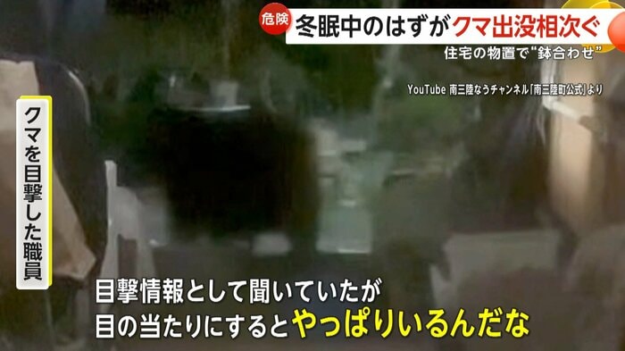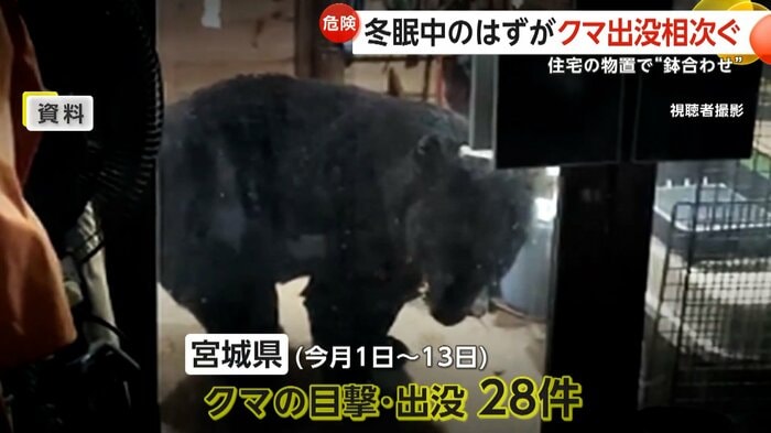 東北地方で冬眠時期のはずのクマの出没が相次いでいる。宮城・南三陸町では9日、体長約1.2mのクマが住宅の物置に侵入する姿が撮影されたほか、福島・喜多方市では物置で眠るクマが発見され、駆除される事案が起きた。専門家は、親グマが駆除されたことで冬眠の方法を知らない若いクマが、人里へ現れている可能性を指摘する。