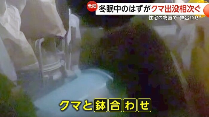 東北地方は本格的な冬に突入しているが、物置のライトで浮かび上がったのは、冬眠しているはずのクマの姿だ。