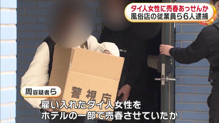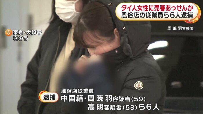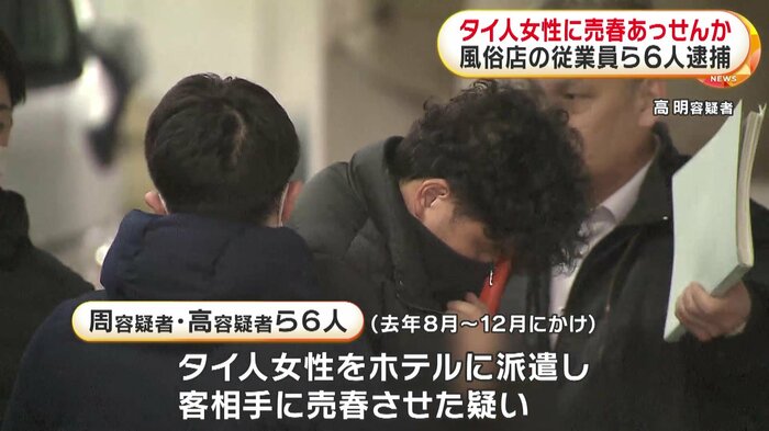 中国籍で風俗店従業員の周暁羽容疑者や高明容疑者ら6人は、2025年8月から12月にかけて、タイ人の女性をホテルに派遣して客を相手に売春をさせた疑いが持たれている。