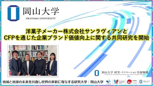 国立大学法人岡山大学(本部:岡山市北区、学長:那須保友)は岡山県里庄町に本社を置く洋菓子メーカー・株式会社サンラヴィアンと、製品のカーボンフットプリント(CFP=Carbon Footprint of Products:製品のライフサイクル全体における温室効果ガス排出量)を切り口とした企業ブランド価値向上に関する共同研究を、2025年12月より開始しました。