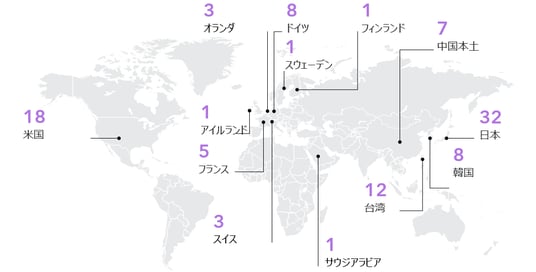 日本は引き続き世界のイノベーションをリードしており、32社が選出されました。また、Top10のうち5社を占め、中国本土と韓国がそれぞれ2社、米国が1社となっています。国別では、日本に次いで米国が18社、台湾が12社、ドイツと韓国がそれぞれ8社と、主要な貢献国となっています。さらに、中国本土、オランダの企業が増加傾向を示し、今年はアイルランドとサウジアラビアがリストに復帰しました。