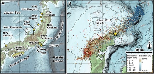 図. 海岸隆起を起こした地震(A)と2024年1月1日能登半島地震と余震(B)