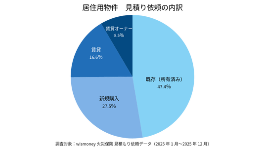 居住用物件における見積り依頼の内訳。既存(所有済み)物件が47.4%、新規購入が27.5%となっており、住宅ローンに伴う初回加入だけでなく、既加入者による補償内容の見直し需要も根強いことが分かります。