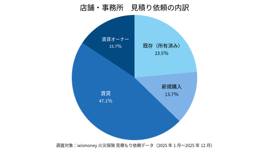 店舗・事務所における見積り依頼の内訳。賃貸物件が47.1%を占め、居住用物件と比較して賃貸利用の割合が圧倒的に高い、事業用特有の流動性が示されています。