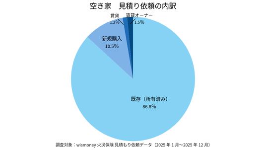 空き家における見積り依頼の内訳。既存(所有済み)物件が86.8%に達しており、新規購入よりも既存資産の維持・管理を目的とした保険検討が主流であることが分かります。