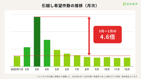 新年度に向けた移動にともない、引越し需要は例年3月周辺が繁忙期です。ミツモアの引越し見積もりデータでも、「第一希望日」として3月を選ぶ人が最も多くなっています。