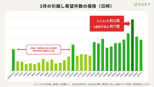2025年3月1日~31日の引越し希望件数を日ごとに見ると、最終土曜日である3月29日に最も多くの希望が集中していました。
