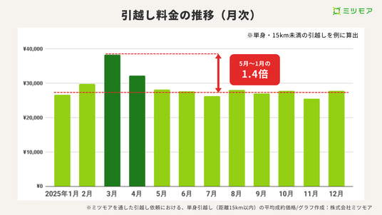 引越しの平均成約費用を月別に見ると、3月の平均費用は通常期(5月~1月)の1.4倍でした。市場の標準的な変動を把握するため、荷物量や移動距離により値段が大きく変わる影響を排除し、単身引越しで15km以内の依頼に絞り算出しています。