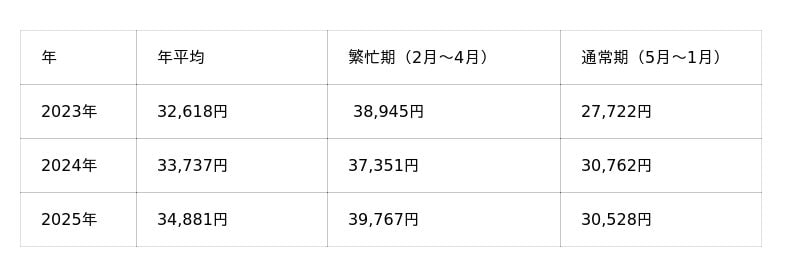 年間の平均成約価格は、2023年から2024年、2024年から2025年と、それぞれ約1,100円ずつ上昇しています。通常期・繁忙期別でみると、2025年の繁忙期が料金のトップとなっています。