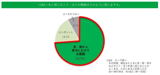 ・ 冬の時期、朝起きたときに首・肩・背中などのこり・はりを強く感じる人が8割以上もいることが判明。さらに、冬に感じるこり・はりの範囲は首・肩から背中にかけて広範囲(73.7%)と感じている人が最も多いことが明らかに。