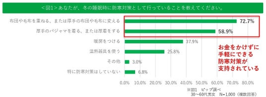 ・ 冬の睡眠時の防寒対策として、暖房や温熱器具に頼るのではなく、「布団や毛布を重ねる、または厚手の布団や毛布に変える(72.7%)」、「厚手のパジャマを着る、または厚着をする(58.9%)」といったお金をかけず手軽にできる方法を選ぶ人が多数を占めている。