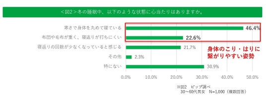 ・ 冬の睡眠中、「寒さで身体を丸めて寝ている(46.4%)」「布団や毛布が重く、寝返りが打ちにくい(22.6%)」など、睡眠中の姿勢や動きに制限がかかっている人が多いことが判明。