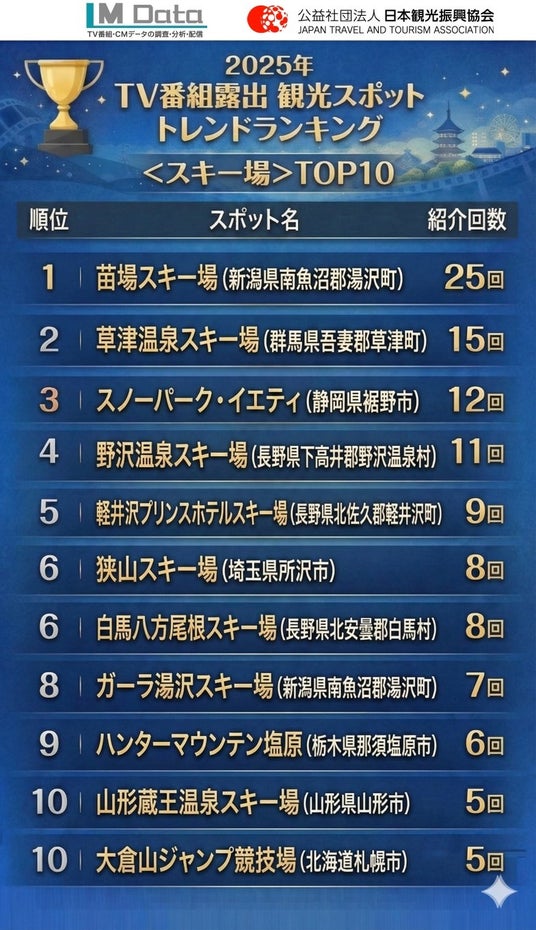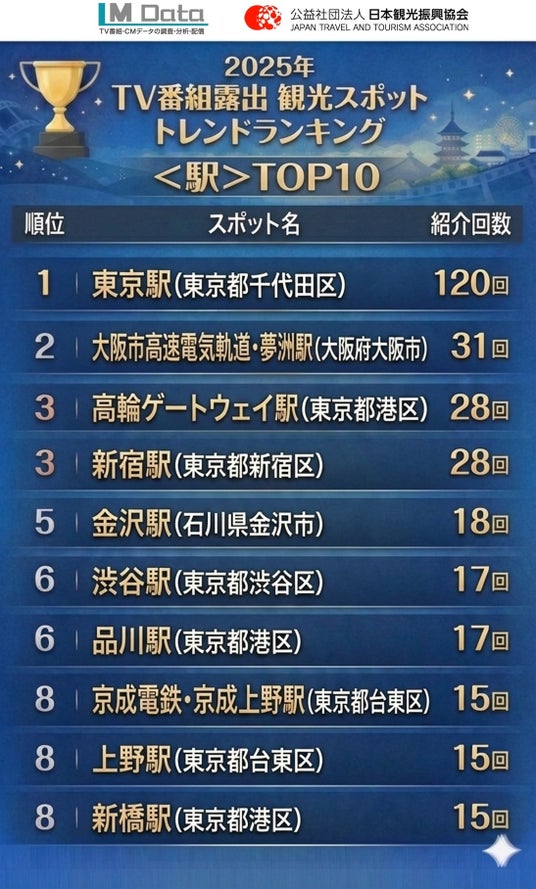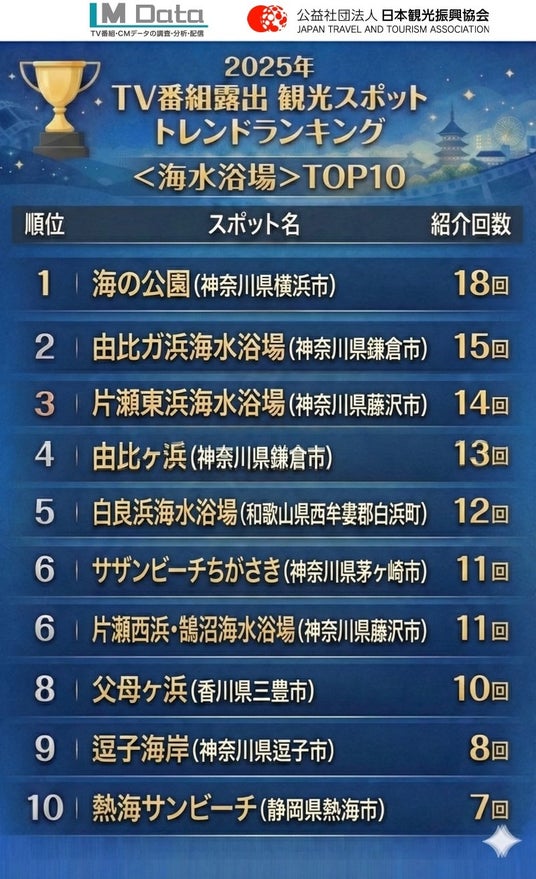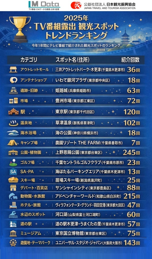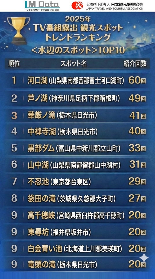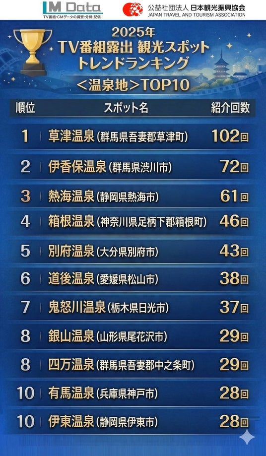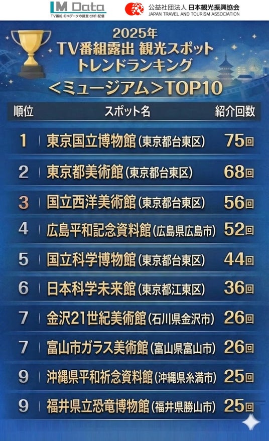 株式会社エム・データ(本社:東京都千代田区、代表取締役社長:薄井司、以下、エム・データ)と、公益社団法人日本観光振興協会(本部:東京都港区、会長:菰田 正信(三井不動産株式会社代表取締役会長)、以下、日観振)は協同で、2025年 TV番組露出 観光スポット トレンドランキング、通称「MBT(最もテレビ報道された観光スポット&トピックスの英訳・Most Broadcast Tourism topics on Japanese televisionの略)」を発表いたしました。