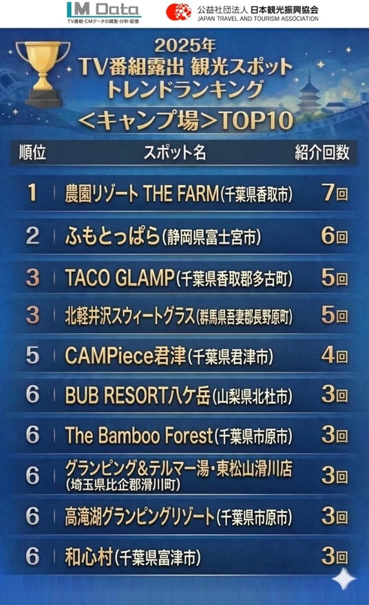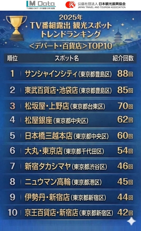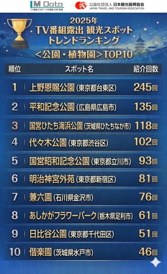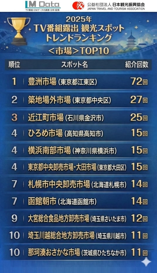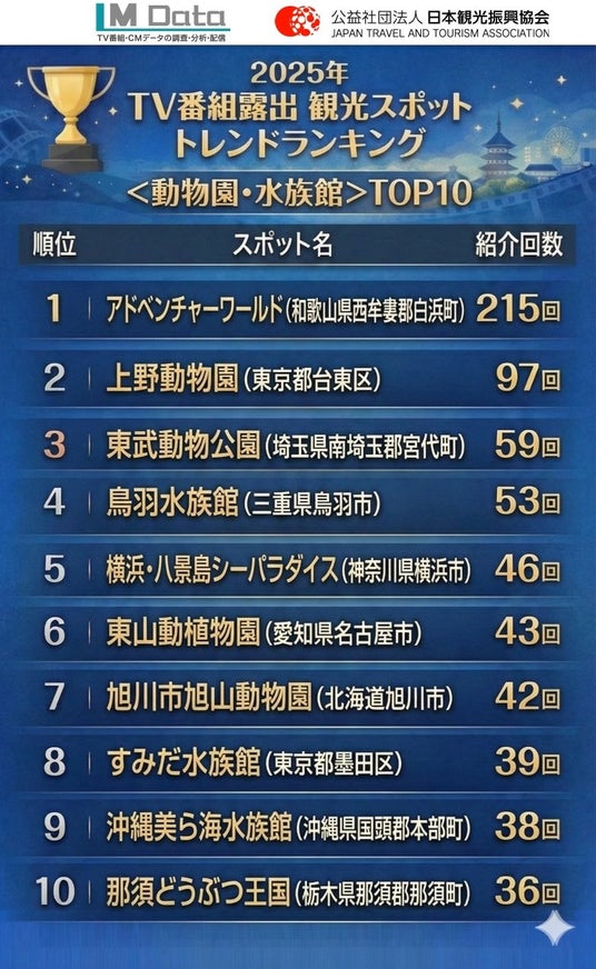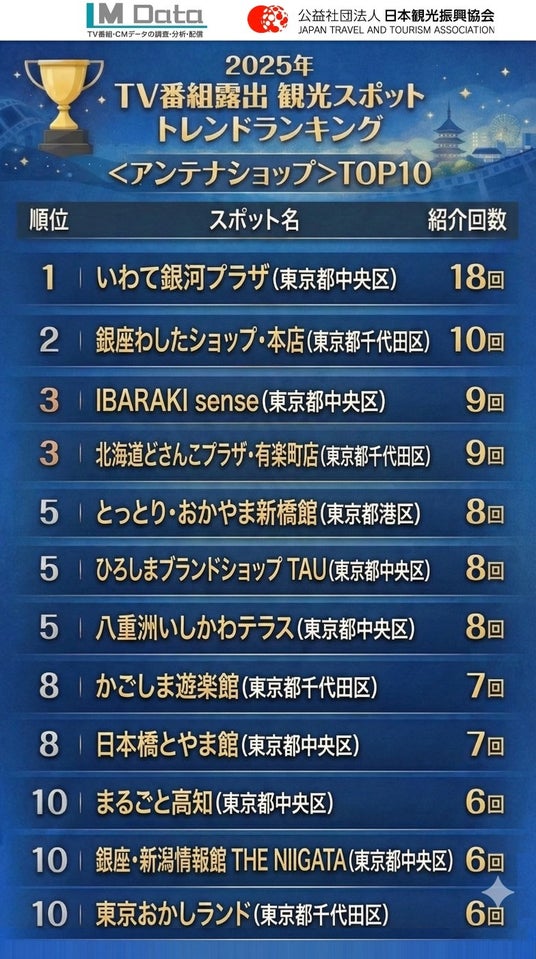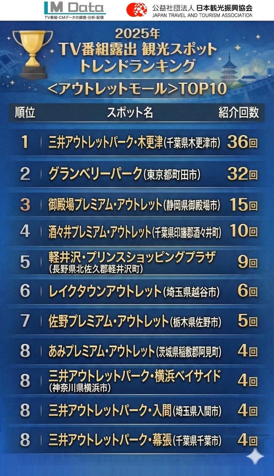 株式会社エム・データ(本社:東京都千代田区、代表取締役社長:薄井司、以下、エム・データ)と、公益社団法人日本観光振興協会(本部:東京都港区、会長:菰田 正信(三井不動産株式会社代表取締役会長)、以下、日観振)は協同で、2025年 TV番組露出 観光スポット トレンドランキング、通称「MBT(最もテレビ報道された観光スポット&トピックスの英訳・Most Broadcast Tourism topics on Japanese televisionの略)」を発表いたしました。