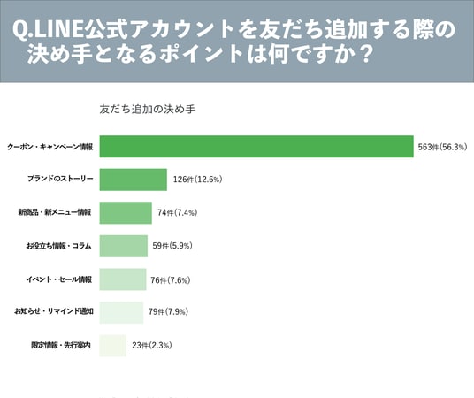 回答の中で圧倒的に多かったのは「クーポン・キャンペーン情報」で563件(56.3%)でした。実利的なメリットが友だち追加の非常に大きな動機となっている可能性が高いです。