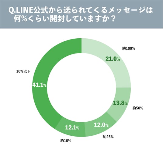 最も多かった回答は「10%以下」で411件(41.1%)でした。多くの公式アカウントから届く通知に対して、ユーザーは選択的に情報を処理している現状が浮き彫りになりました。
