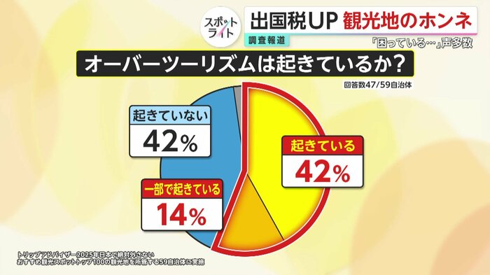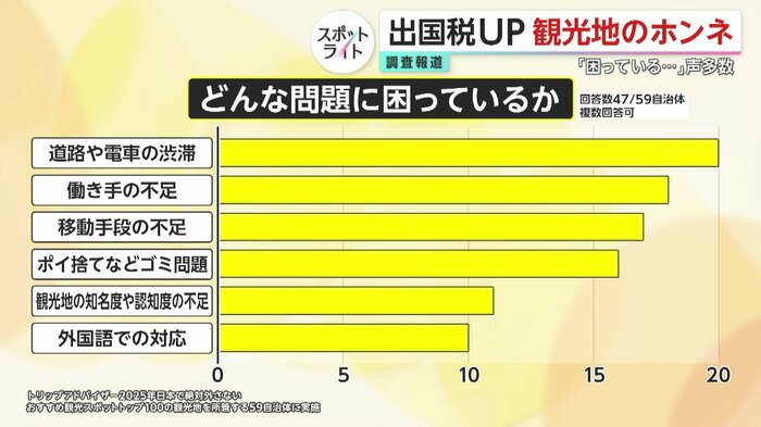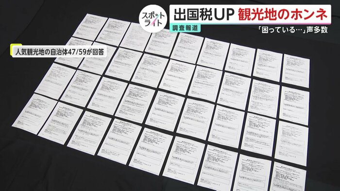 フジテレビでは、全国の観光地をかかえる自治体からアンケートをとり、出国税が増税されたらどんなことに使いたいのか意見を聞いた。世界最大級の旅行情報サイト「トリップアドバイザー」で、日本の人気上位100に入る観光地を持つ自治体を調査対象とした。