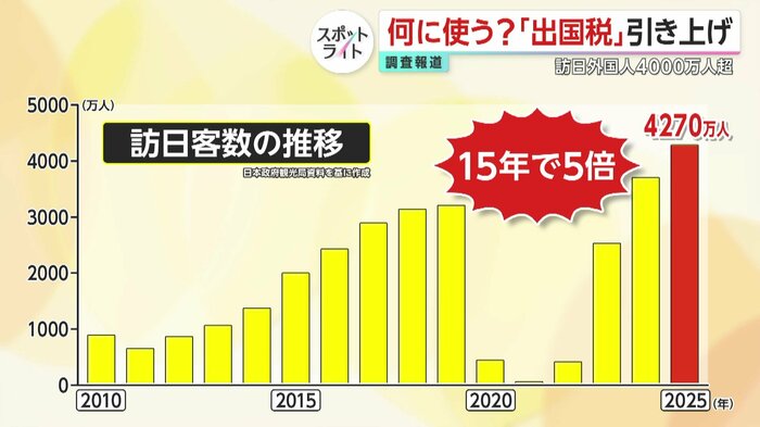 街の人に聞くと、「歩きたいように歩けないぐらい」「食事のところが混んでて結構、多言語が飛び交っていたので」「キャパオーバーしているかなと」などの声が…。この問題の解決の一手として政府が決定したのが国際観光旅客税、いわゆる出国税の増税である。