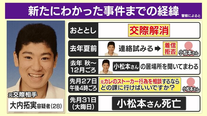 すると大内容疑者は、秋ごろから12月にかけて周囲に小松本さんの居場所を聞き込むなど、ストーカーのような行為をしていたということです。