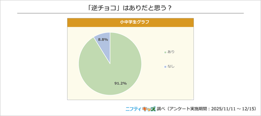 約9割の小中学生が、逆チョコは「あり」と考えていることがわかりました。「本命チョコ」「義理チョコ」「友チョコ」「自分チョコ」など、バレンタインデーのチョコの種類は多様化しており、「逆チョコ」もバレンタインチョコの1種として違和感なく受け入れられている様子がうかがえます。