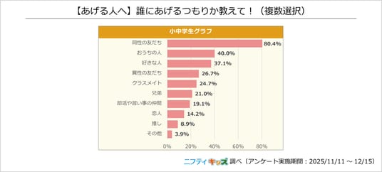 最も多かった回答は「同性の友だち」で、小中学生の約8割を占めました。一方、「好きな人」にあげると回答した人は37.1%で、友だち同士で「友チョコ」を交換する習慣が広がっていることがわかります。