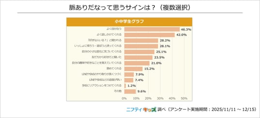 1位は46.3%の「よく目が合う」でした。僅差で2位は「よく話しかけてくれる」で、「『好きな人いる?』と聞かれる」「一緒に帰ろう・遊ぼうと誘ってくれる」「自分の小さな変化に気づいてくれる」が続きました。