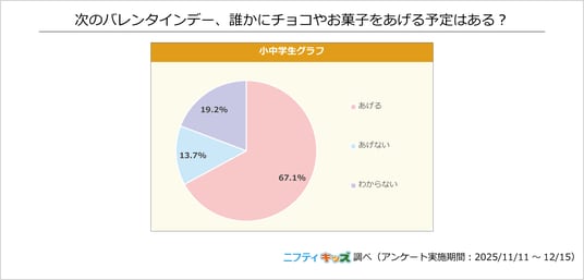 67.1%の小中学生が、次のバレンタインデーに誰かにチョコやお菓子を「あげる」と回答しました。「バレンタインデー」という行事を重視している人が多いことがうかがえます。