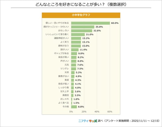 60%の人が、「優しい・思いやりがある」点を重視して好きになることが多いと回答しました。2位は「顔がかっこいい・かわいい」という外見に関する要素で、続いて「おもしろい」「一緒にいて落ち着く」がランクインしました。