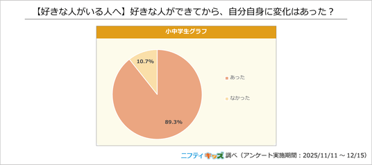 好きな人がいる小中学生の約9割が、好きな人ができたことによる自分自身の変化を自覚していると回答しました。