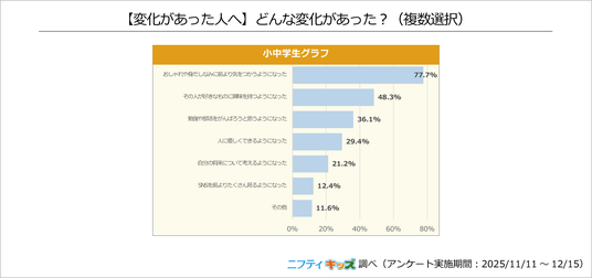 具体的な変化としては、77.7%の小中学生が「おしゃれや身だしなみに前より気をつかうようになった」と回答しました。