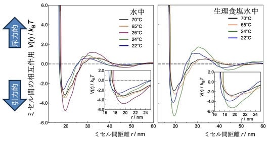 図2:生理食塩水中での高分子ミセル間のゲル化段階やゲルの崩壊過程での相互作用場。横軸はミセル間の距離を示し、縦軸はマイナス方向が引力的な相互作用が強いことを、プラス方向は斥力的な相互作用であることを示す。 (左図) 水中での高分子ミセル間の相互作用場で、22℃、24℃、26℃がゲル化温度より低温でのゲル化段階であり、65℃と70℃はゲルが崩壊し非晶質の集合体に相当する状態。 (右図) リン酸緩衝生理食塩水PBS(−)中での高分子ミセル間の相互作用で、22℃と24℃がゲル化温度より低温でのゲル化段階であり、65℃と70℃はゲルが崩壊し非晶質の集合体に相当する状態。各相転移温度は、粘度測定(図1b)により決定。水中より生理食塩水中で、縦軸がマイナスにより大きな値を示しており、引力的相互作用が水中より生理食塩水中で強くなっていることを示している。