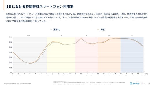 1日の時間帯別スマートフォン利用率を見ると、50代は全年代と非常に近い推移を示しています。