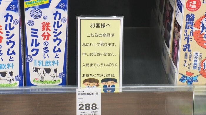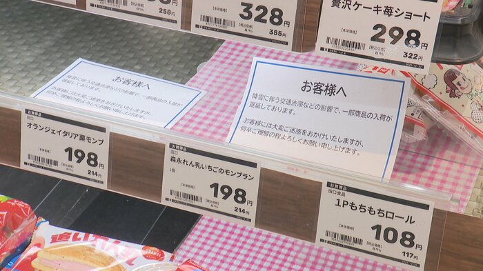 「一部欠品しているものは、札をさして分かるようにしている」と豊田副店長。21日から北陸の広い範囲で高速道路が通行止めになったことで、牛乳やデザート類、もやしなど一部の商品で入荷が遅れている状況だ。