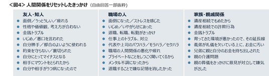 リセットしたきっかけは、友人・知人は「面倒/うっとうしい/疲れる」「性格や価値観、考え方が合わない」、職場は「面倒になった/ストレスを感じた」「いじめ/いやがらせにあった」、家族・親戚関係では「遺産相続」「金銭トラブル」という声が聞かれた。<図4>