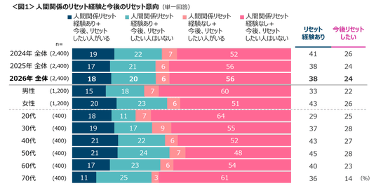 株式会社クロス・マーケティング(本社:東京都新宿区、代表取締役社長兼CEO:五十嵐 幹)は、2026年1月、全国47都道府県に在住する20~79歳の男女2,400人を対象に「人間関係に関する調査(2026年)」を実施しました。沈んでいるときに救われたり、ストレスにもなる「人間関係」について、リセット経験や意向、リセットした人との間柄、リセットのきっかけと方法、人とのつきあい方の変化と考え方、年賀状送付状況をピックアップし分析をしました。
