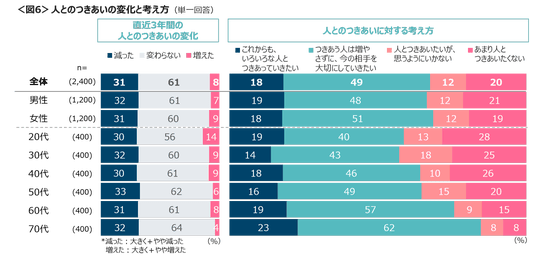 直近3年間の人とのつきあいは「変わらない」が61%、「減った」31%、「増えた」8%。減った割合は年代による差はないが、増えた割合が最も多かったのは20代の14%であった。人とのつきあい方に対する考えは、「つきあう人は増やさずに、今の相手を大切にしていきたい」49%、「あまり人とつきあいたくない」20%、「これからも、いろいろな人とつきあっていきたい」18%。「あまり人とつきあいたくない」は、年代が若いほど増加傾向にあり、20代は28%を占める。<図6>