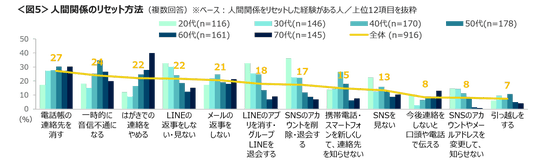 どのようにリセットしたかについては、「電話帳の連絡先を消す」「一時的に音信不通になる」がTOP2。特に20代は、LINEを含むSNSでのリセットが極めて高い。70代は「はがきでの連絡をやめる」が多かった。<図5>