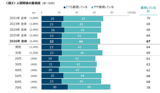 人間関係を「とても重視している」は23%、「やや重視している」は44%、合わせて67%は人間関係を重視している。 70代の重視度は78%と最も高く、低いのは20~40代であった。<図2>
