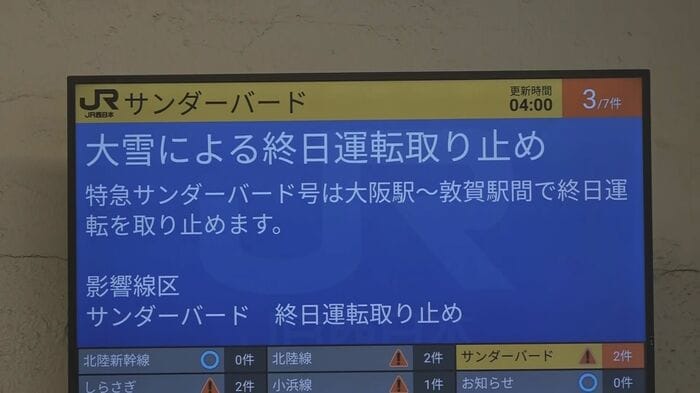 「大雪の影響で京都大阪方面、米原名古屋方面へ敦賀を発着する在来線、すべての列車の運転を取りやめます」