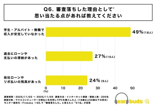 学生・アルバイト・無職で収入が安定していなかった 48%(15人)/過去にローンや支払いの滞納があった 32%(10人)/他社ローンやリボ払いの残高があった 24%(10人)