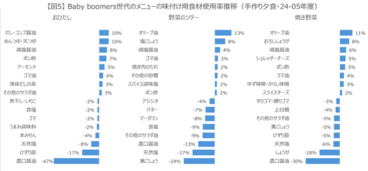 【図5】はBaby boomers世代のメニューの味付け用食材使用率を05年度→24年度の変化を差分にしたものです。まず、共通して見られるのは、「濃口醤油から減塩醤油」「サラダ油からオリーブオイル」への移行です。この流れは、近年高まっている健康意識が調味料選びにも反映されていることを示しており、特に健康に気を遣わざるを得なくなる年齢になったBaby boomers世代では、この傾向が強く出ると言えます。