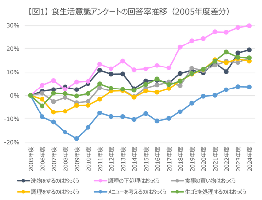 【図1】は、食生活に関する意識アンケートの回答率の推移を20年前の2005年度(4月~翌年3月)との差分で示したものです。