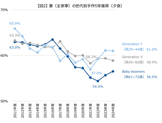 かつては「最も手作りをしている」というイメージが強かったBaby boomers世代ですが、2018年度以降は「最も手作りをしていない世帯」へと逆転し、他世代との差も年々拡大しています。