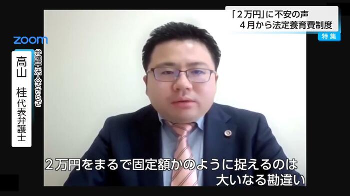 弁護士法人きさらぎの高山桂代表弁護士は、「2026年4月1日から施行される法定養育費は、子ども1人に対し月2万円の養育費が夫婦間の合意がなくとも法律上当然に発生すると定めた新制度」だと説明する。