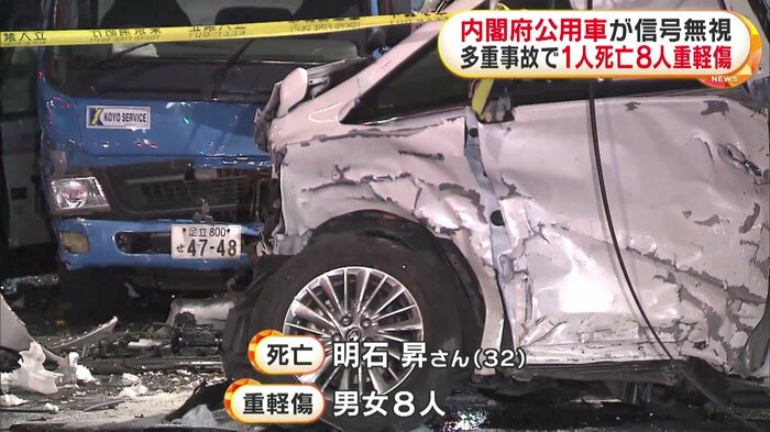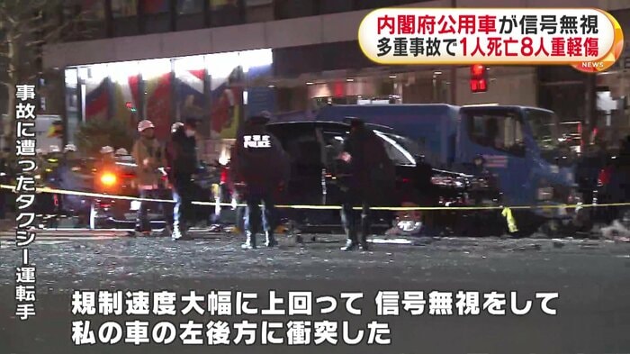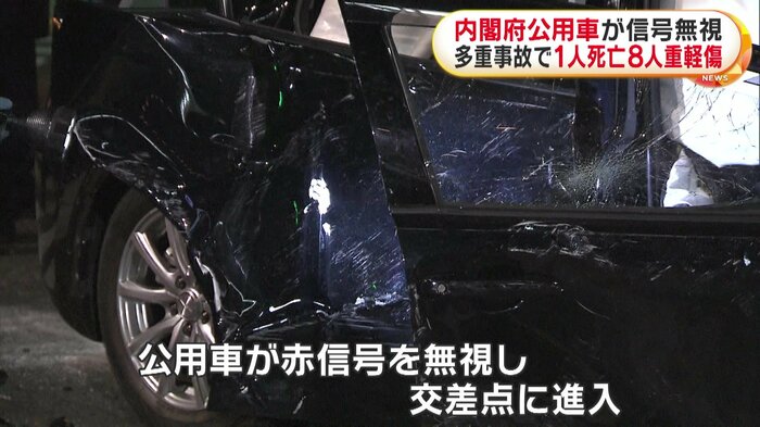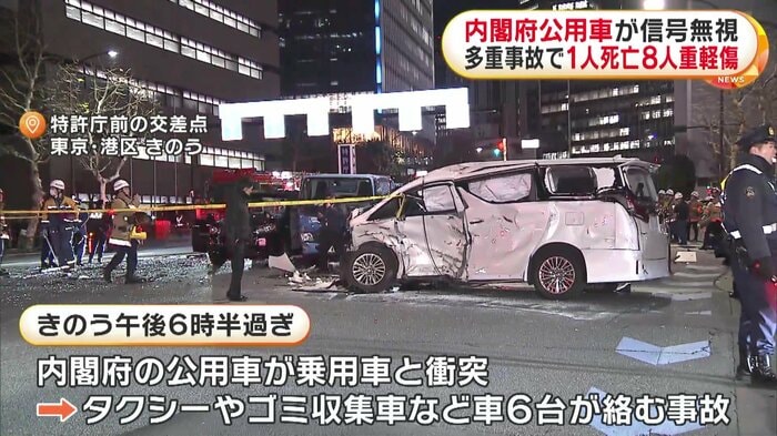 東京・港区の特許庁前の交差点で22日、内閣府の公用車が赤信号を無視して、車6台が絡む事故を起こし、1人が死亡、8人が重軽傷を負った。